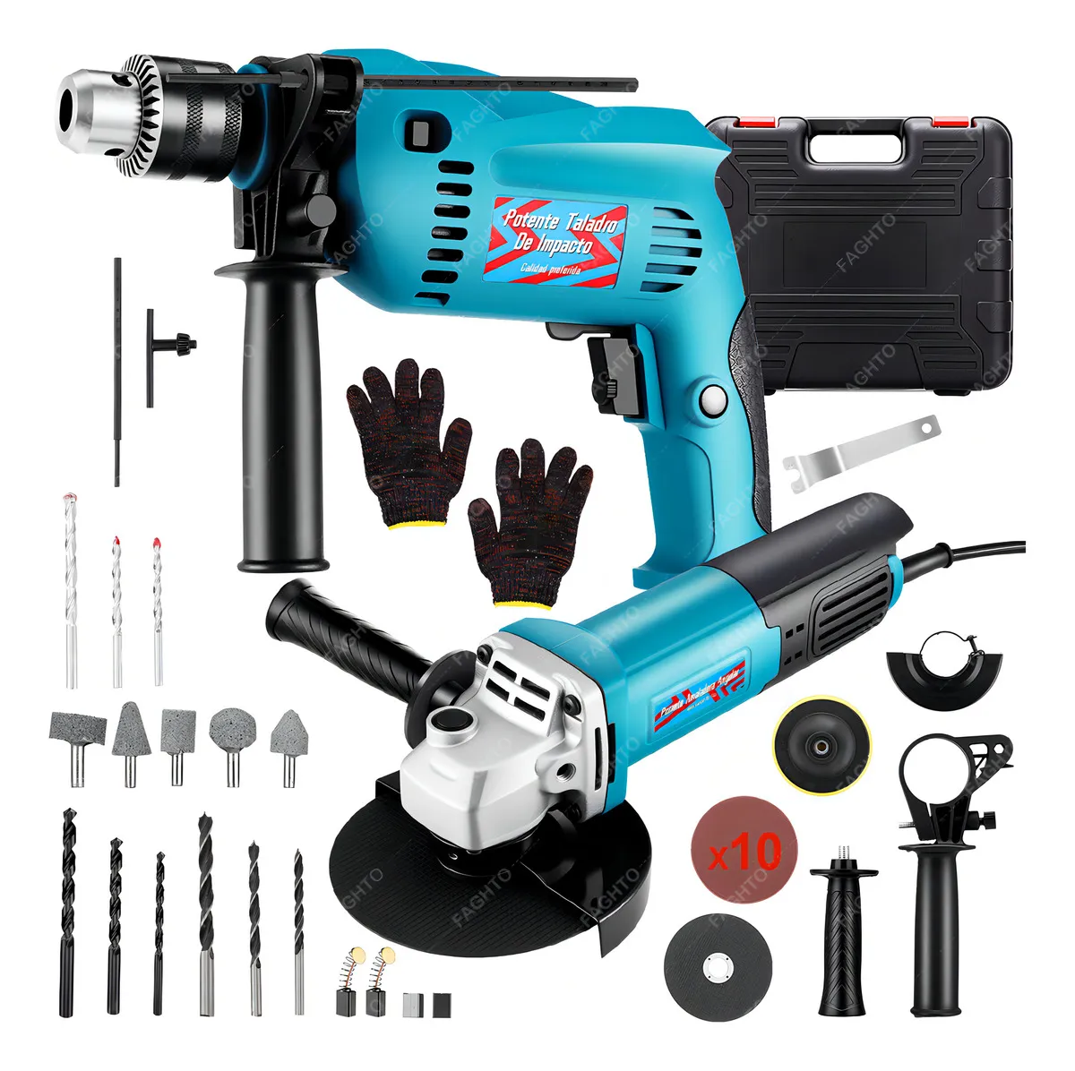 Kit De Taladro Impacto Y 125MM Amoladora Angular FAGHTO 1200W Taladro Rotomartillo Industrial Electrico Y Esmeriladora Angular Eléctrica 14000Rpm Con 37 Accesorios