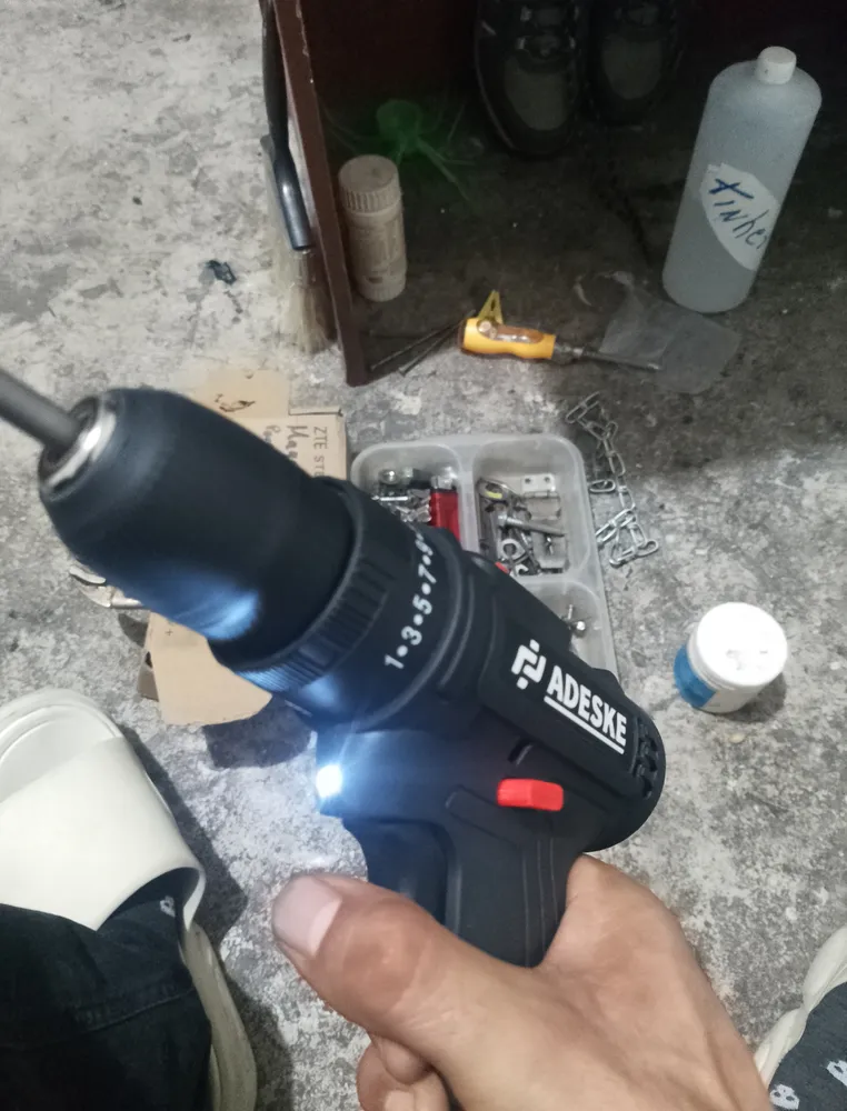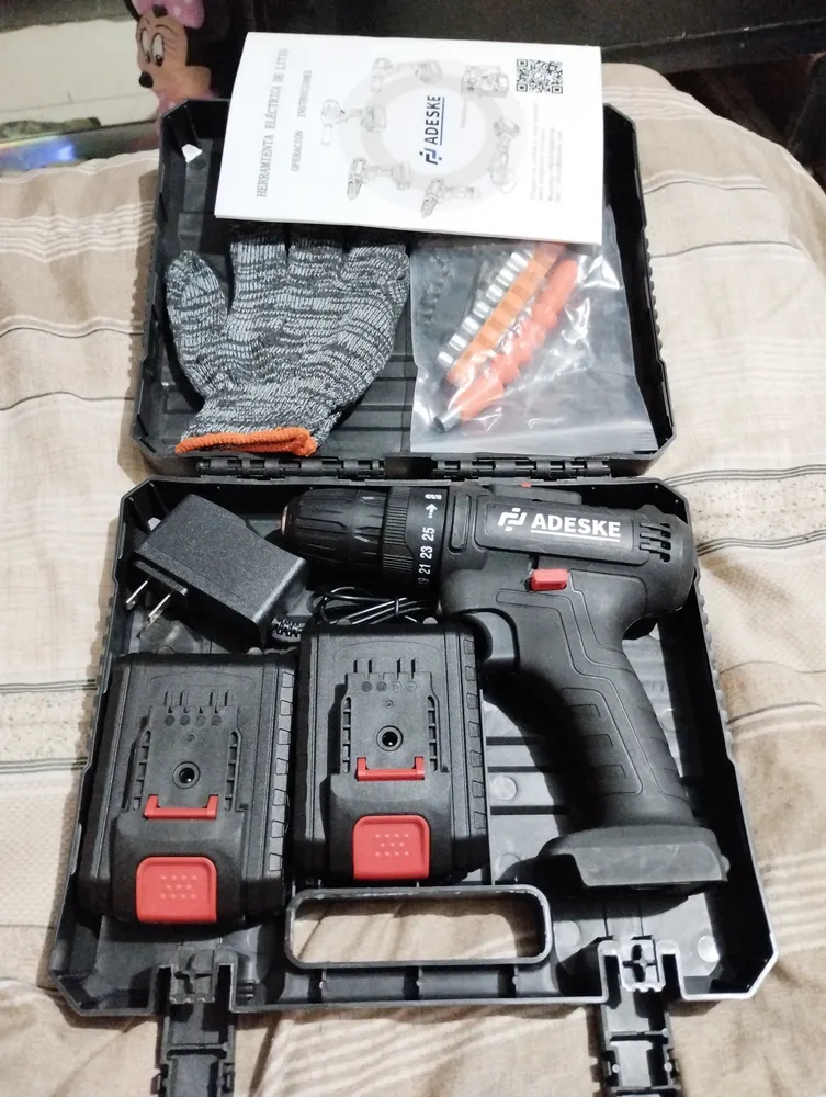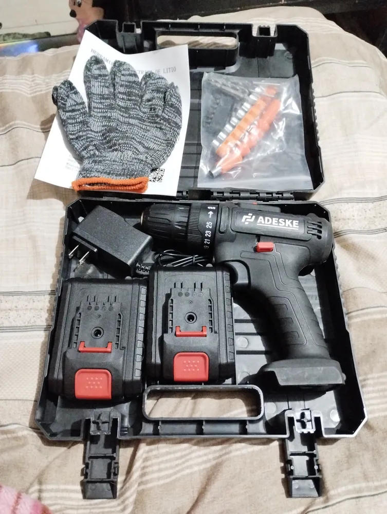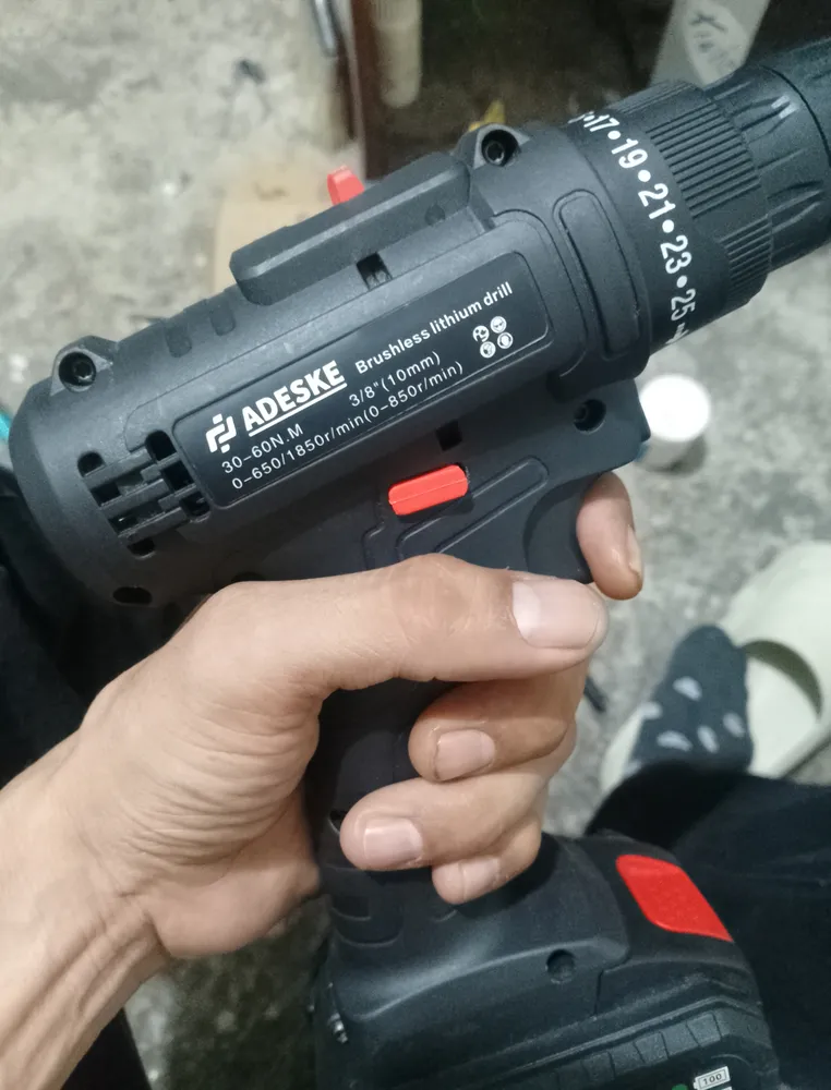 Taladro inalámbrico marca ADESKE diez ventajas: 1. Taladro eléctrico: Modos de trabajo del taladro inalámbrico: sujeción y perforación. El rango de ajuste de torque es de 40 a 100 Nm, lo que puede satisfacer fácilmente las necesidades de perforación y fijación de madera, metal y plástico. 2.25+ Velocidad variable: El taladro inalámbrico tiene un interruptor de doble velocidad de 0 a 650 RPM y de 0 a 1850 RPM. Con 1 modo de trabajo y más de 25 niveles de control de velocidad variable, puede ajustar la velocidad y el modo de trabajo según sus necesidades de perforación o extracción de tornillos y pernos. 25 niveles de torsión ajustable proporcionan un control preciso de la perforación en madera, concreto, plástico o tornillos para cumplir con los requisitos de torsión en diferentes situaciones. 3. Todo el motor de cobre: El motor totalmente de cobre tiene un rendimiento estable y confiable, reduce la aparición de riesgos de seguridad como parada de emergencia y cortocircuito de la ba