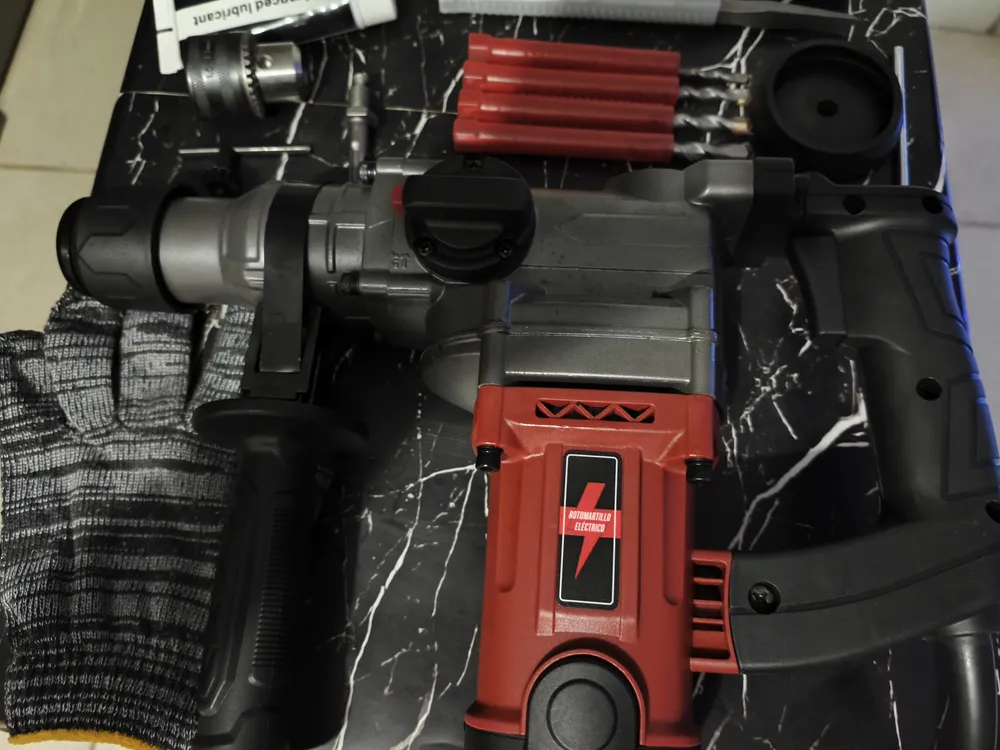 Introducción de la marca FAGHTO® es un taller de herramientas profesional Todos los productos deben someterse a estrictas inspecciones de calidad y pruebas de seguridad antes de que puedan venderse. Nuestra filosofía es producir productos de la mejor calidad para los clientes. Nota: La primera imagen muestra el efecto de instalación del medidor de profundidad. Este se puede desmontar e instalar. El diseño mejorado del mango giratorio de 360° es más práctico y fácil de usar. [3500W taladro rotomartillo profesional 3 en 1]Tres funciones diferentes de perforación (Se puede utilizar para perforar madera, metal/azulejos, etc. ), Modo pico eléctrico (Se puede utilizar para quitar paredes de cemento y baldosas de cerámica.) y taladro de martillo-10J (Se puede utilizar para perforar agujeros en hormigón y granito-adecuado para trabajos pesados) función se adaptan a una variedad de escenarios de trabajo que son fáciles de cambiar. (Nota:La función de taladro eléctrico requiere un portabrocas