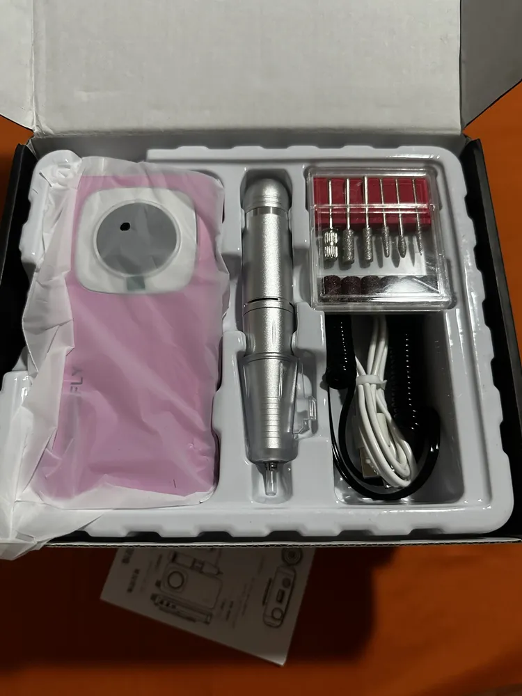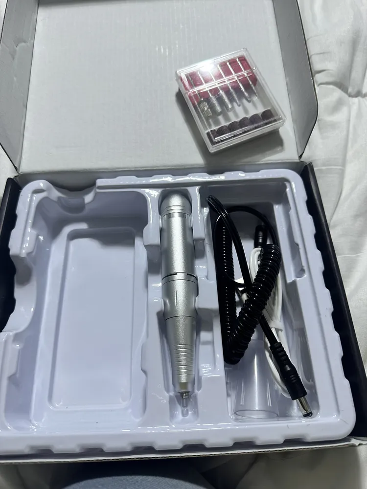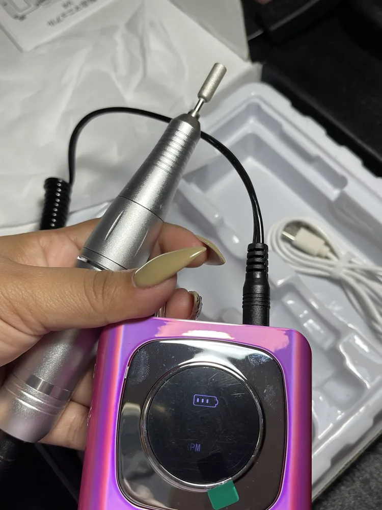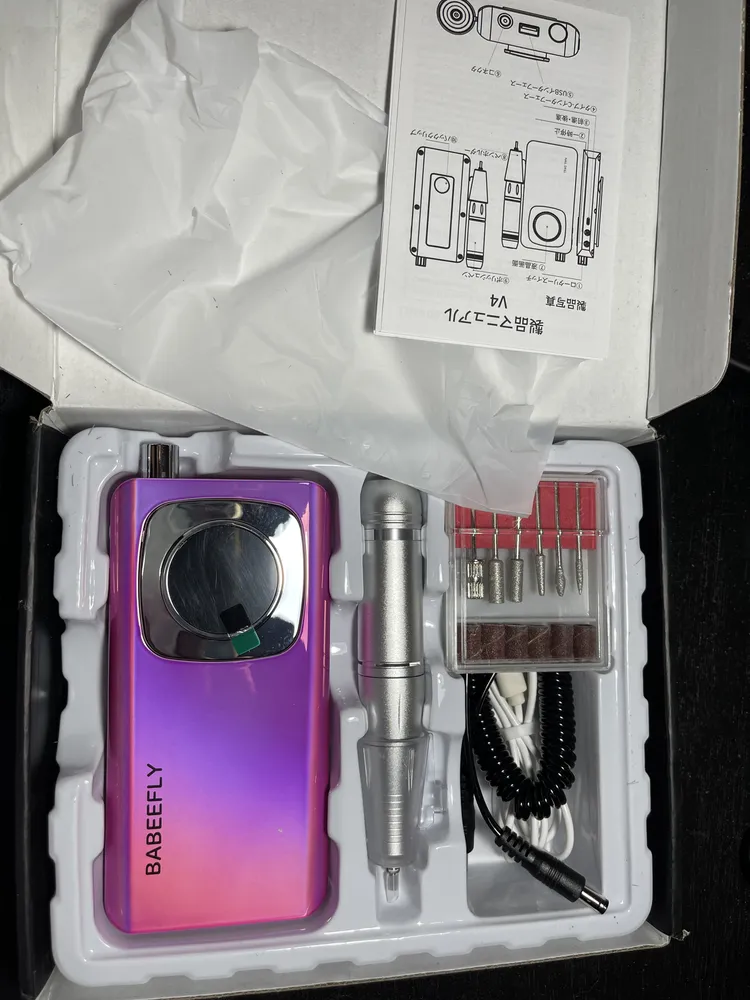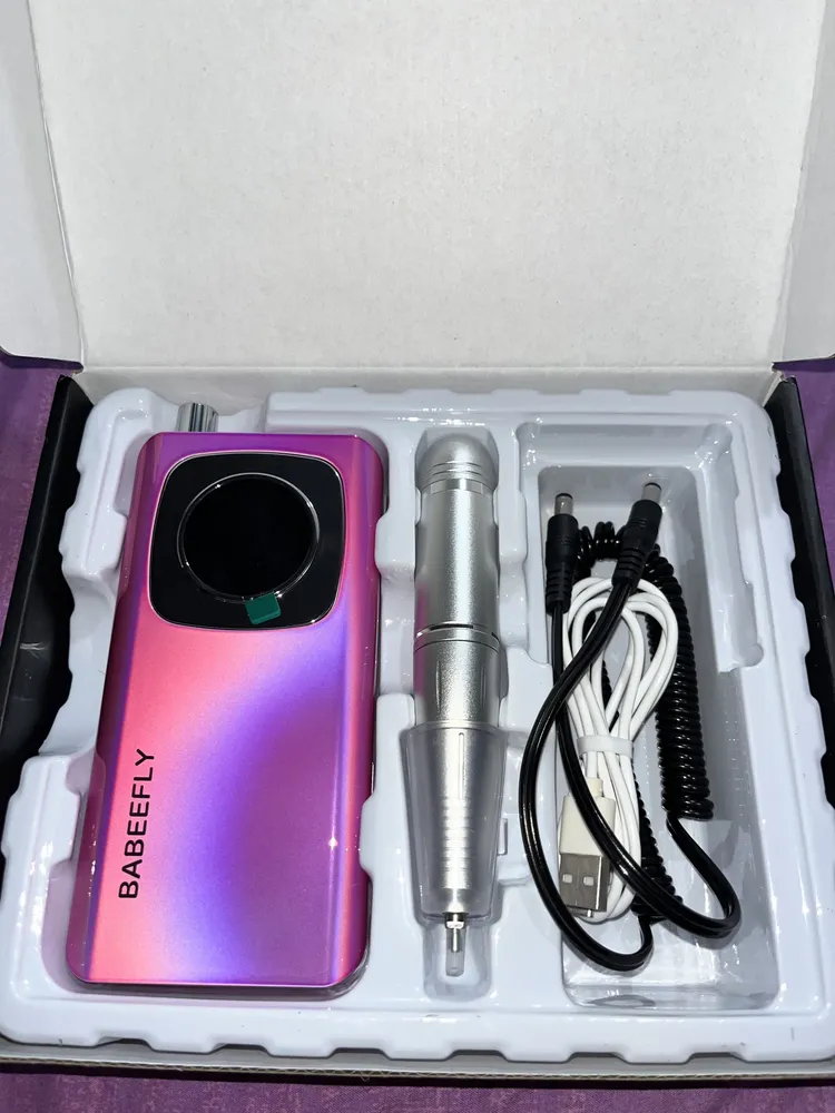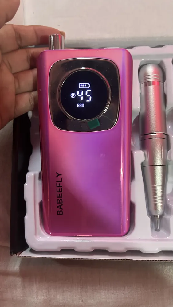 Características del taladro de uñas BABEEFLY--M504: ================================================== 1. Juego de taladro de uñas de 0 a 45000 rpm, Velocidad ajustable de alta velocidad y funcionamiento suave,adecuado para uso personal y de salón. 2. Batería de 4000 mAh, batería de larga duración; la pantalla LED puede mostrar la dirección de rotación, la velocidad en tiempo real y la energía de la batería, lo que hace que los ajustes sean más precisos. 3. Diseño en forma de lápiz, cómodo de sostener; material de aleación de aluminio, rápida disipación del calor y bajo nivel de ruido. Equipado con un clip trasero para facilitar su transporte. 4.Máquina pulidora de uñas inalámbrica multifuncional, diferentes tipos de brocas para esmerilar, tallar, cortar, pulir y quitar uñas acrílicas naturales, esmalte en gel, uñas en polvo, callos, cutículas, etc ------------------------------------------------------------------ Contenido del Paquete: 1 * Pulidor de uñas 6 * Esmeril para uñas + 6